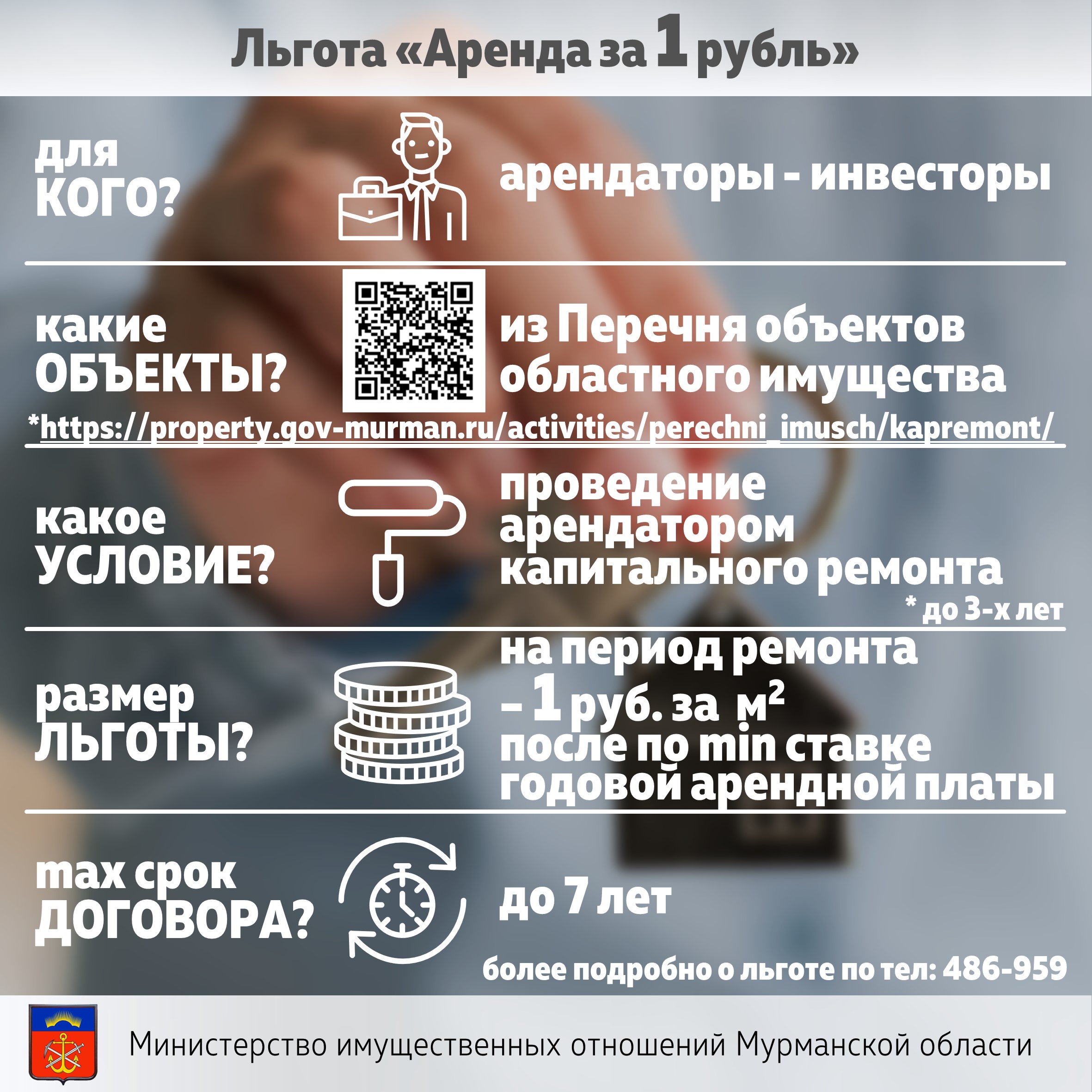 Льгота предоставляется при заключении договора аренды областного имущества, включенного в перечень, утвержденный Правительством Мурманской области, без проведения торгов, в случаях предусмотренных Федеральным законом от 26.07.2006 № 135-ФЗ «О защите конкуренции» и при условии проведения потенциальным арендатором капитального ремонта.