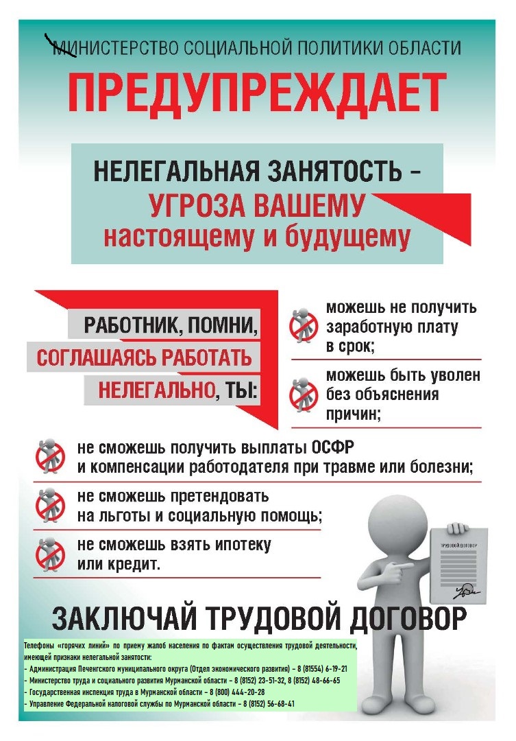 Рабочая группа МВК Мурманской области по противодействию нелегальной занятости в Печенгском муниципальном округе напоминает:Нелегальная занятость – угроза Вашему настоящему и будущему